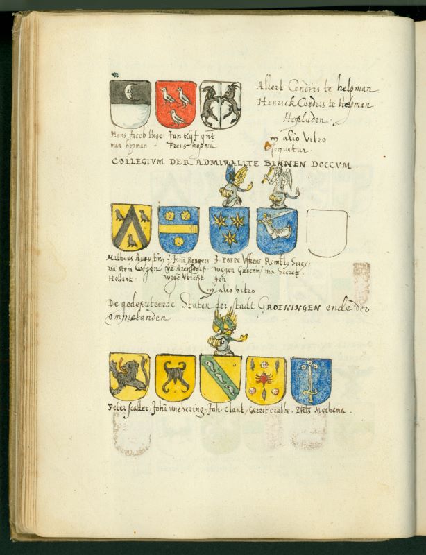 Een mooi voorbeeld is de pagina met wapens van de leden van het College van de Admiraliteit van Friesland en Groningen te Dokkum, hierbij afgebeeld.