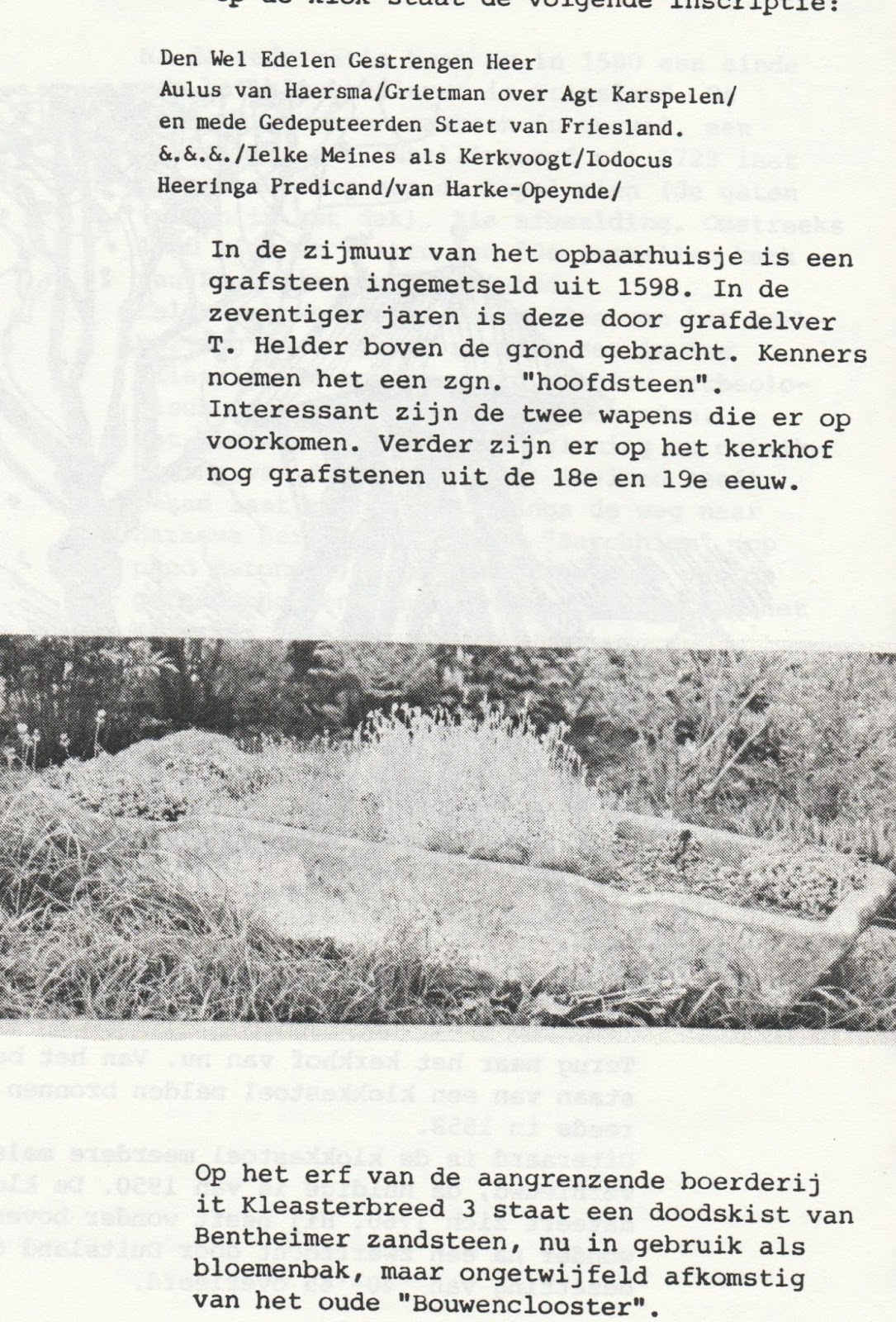 In De Sneuper 117 hadden we een coverartikel over de 13e eeuwse sarcofagen van Westergeest. De auteur en expert op dit gebied, Piet Heinsbroek, is helaas inmiddels overleden, maar heeft waarschijnlijk ook over de sarcofagen van Beetsterzwaag gepubliceerd. Ik heb deze publicatie alleen nog niet kunnen achterhalen. Mocht u deze kennen, dan ontvang ik graag een digitale kopie.