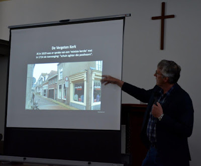 Ook Piet de Haan kwam aan het woord: ‘Ik krijg 10 minuten van de heer Jansen’. Hij deed uit de doeken hoe ze een onbekend vermaanhuis hebben ontdekt in de binnenstad; een vergeten kerk uit het verleden die tot leven is gebracht in het boek! Omdat de kerk niet zichtbaar aan de openbare weg mocht liggen moesten de Mennisten via een steeg naar hun kerkgebouw. Piet liet zien waar het voormalige vermaanhuis heeft gestaan en langs welke steeg men naar binnen kon. De steeg bestaat nog steeds!